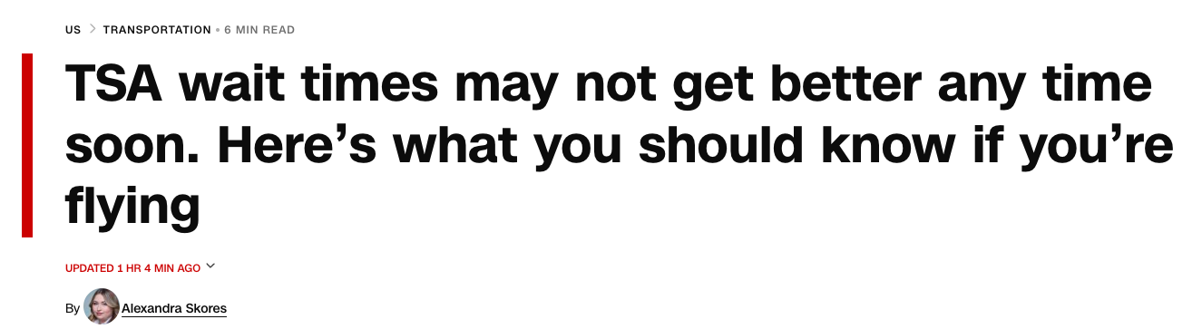 目前尚不清楚国土安全部停摆何时结束。代表TSA员工的工会对此并不乐观。要结束停摆,国会必须通过为该部门拨款的法案,但目前尚未看到达成协议的迹象。