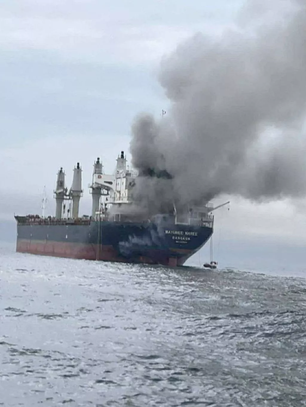 泰国散装货轮“Mayuree Naree号”11日在波斯湾荷莫兹海峡阿曼以北海域遭遇不明火力攻击。泰国海军发布照片显示,船上浓烟弥漫。(泰国皇家海军提供/路透)