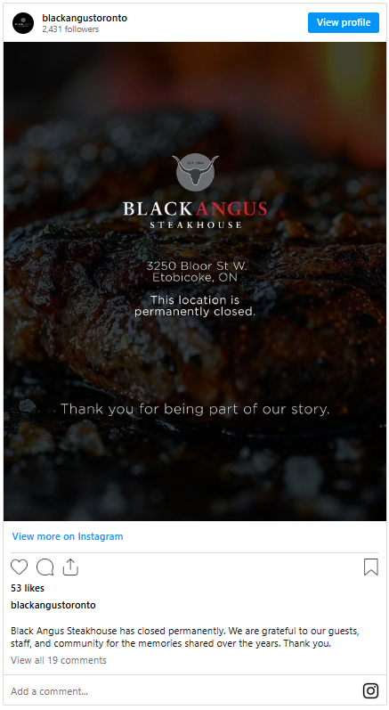 blogTO已联系Black Angus Steakhouse询问关闭原因,但截至本文发布时仍未收到回复。
