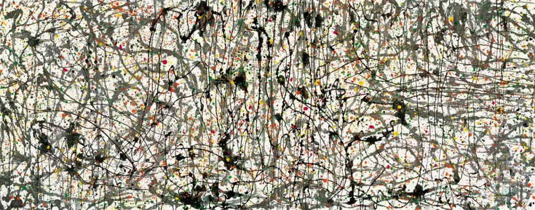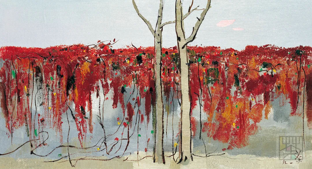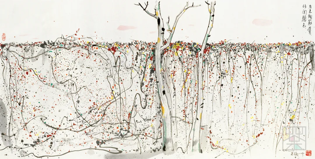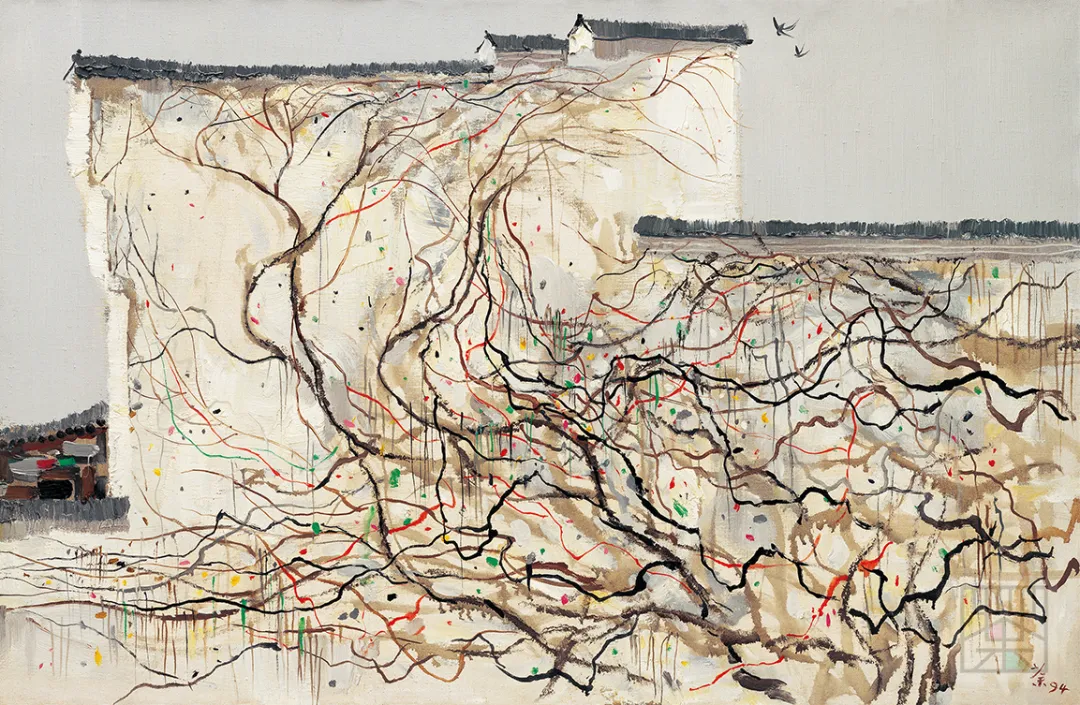 “最是吸引画家的,是一堵雪白的粉墙,这里听凭画家施展才华,抒写情怀,泼墨挥洒。然而这素净的墙面往往先被爬山虎之类的藤线占领了,她蜿蜒曲折,悠游自在地绘写成绝妙之画图,令画家望之惊喜、慨叹、却步。苏州留园有一块巨大的山墙,墙上布满了藤线,年代久远,藤本已粗如臂、腿,层层叠叠,交错穿插延伸到高远处的藤线则细于柳丝,柔于纤草,粗线细线在墙上相交又相离,缠绵悱恻。早春,遍体吐新芽万点青、黄布满了棕色的枝藤;深秋,残红错落地点缀上、下、左、右,都似拍节的音符,共奏点、线之曲。我画过多幅油彩和墨彩的墙上秋色,当然母体不再只是留园的了。但最感棘手的总是那墙之局限,它的体形反过来约束了藤之伸展,而墙外的天空又或多或少占去了画面的空间,割据了部分藤之领域。我将天空压缩到最小限度,则又不能显示山墙之体态与本质。经过多次较满意的、不满意的、彻底失败的经验,这回用巨幅表现墙上秋色,不再局限于墙之体态身段,拆掉了墙之界限,画幅就是墙,满眼都是墙,藤于是在无形的墙上伸展、奔驰、跌跌撞撞……似乎也失去了指挥,春芽、秋叶纷纷喷发,泼散,是怎样的乐章呢?画名《墙上秋色》,作者写的是人世春秋了。”