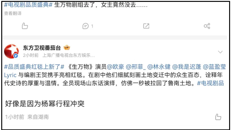 虽说白玉兰奖前哨战的说法是近两年才出现的,但在SMG主办的颁奖礼上,《生万物》全员拿奖独缺杨幂一事,也是越看越觉得微妙。