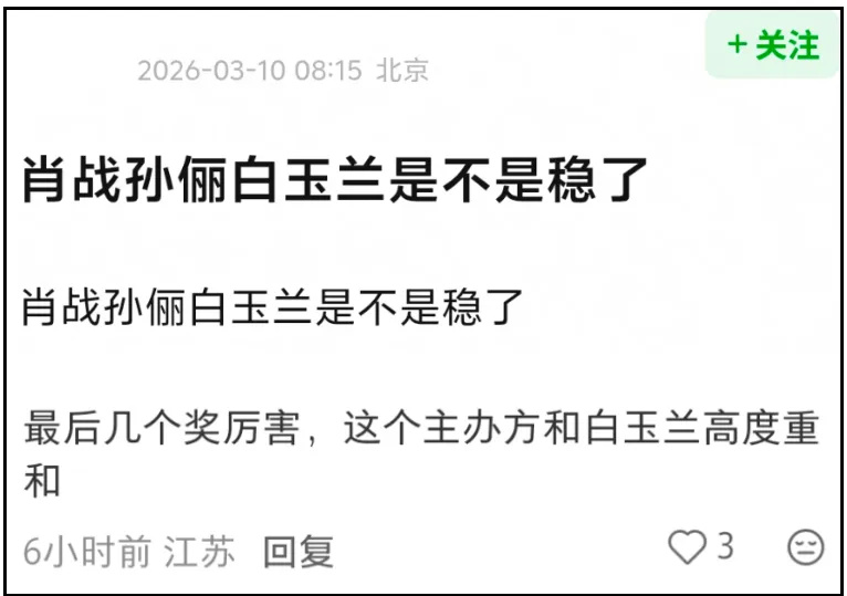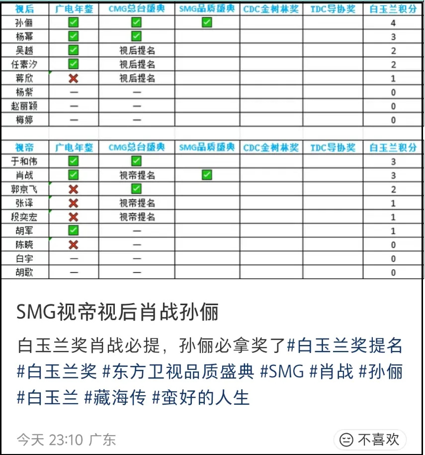 别忘了,杨幂的总台视后是和孙俪一起拿的呀,《生万物》和《蛮好的人生》都是在央视播出的,白玉兰奖可是传说中的沪奖。