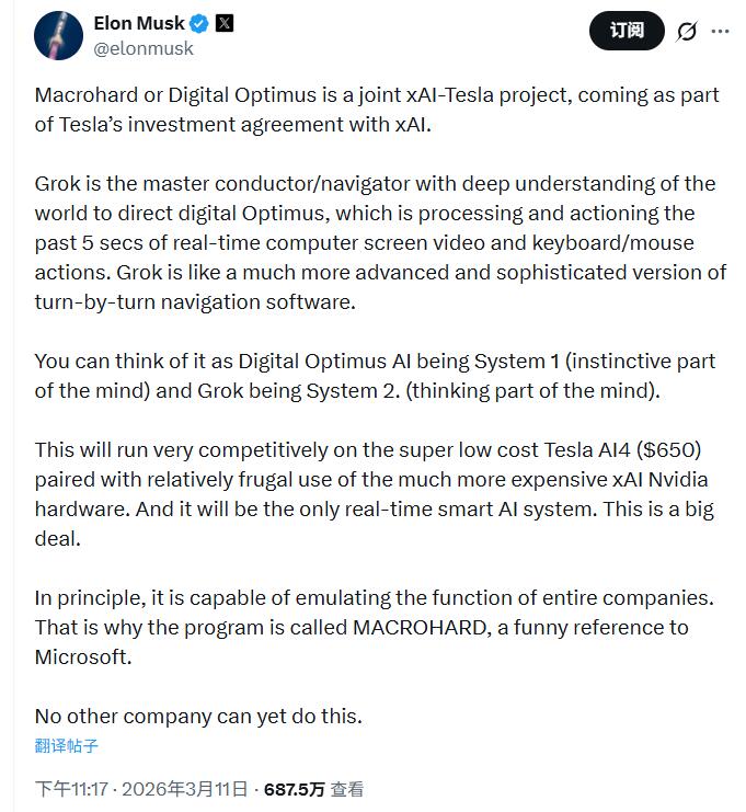 美东时间11日周三,马斯克在旗下社交媒体发帖宣布,特斯拉与他的AI初创公司xAI将联合开发一个名为“Digital Optimus”(数字擎天柱)、又称Macrohard(巨硬)的新AI项目,旨在打造能够自动执行软件任务的AI智能体系统。