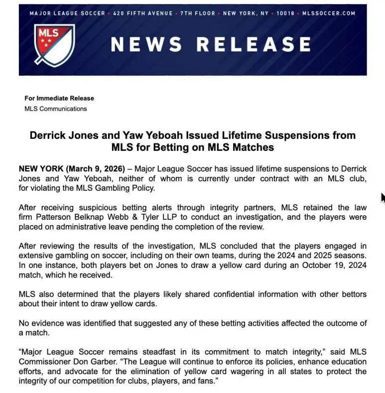3月10日,美国职业足球大联盟(以下简称:“美职联”)宣布,曾效力于美职联的两名球员德里克·琼斯和叶博亚因涉赌被美职联终身禁赛。