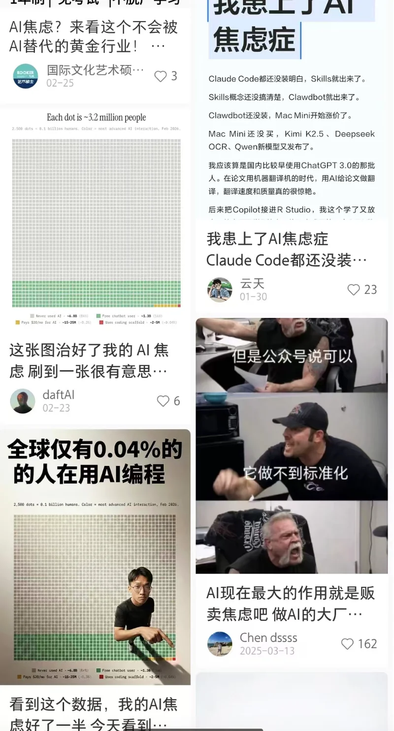 普通人怕的是落后。不是落后于某一个具体的竞争对手,而是落后于整个时代。身边总有人说"AI要取代你的工作了",新闻里总有某个行业被颠覆的故事,朋友圈里总有人配文"以后不会用AI的人会被淘汰"。这些信息日复一日地轰炸下来,在普通人心里积累出一种慢性焦虑——我是不是已经落后了?我是不是正在被时代甩开?