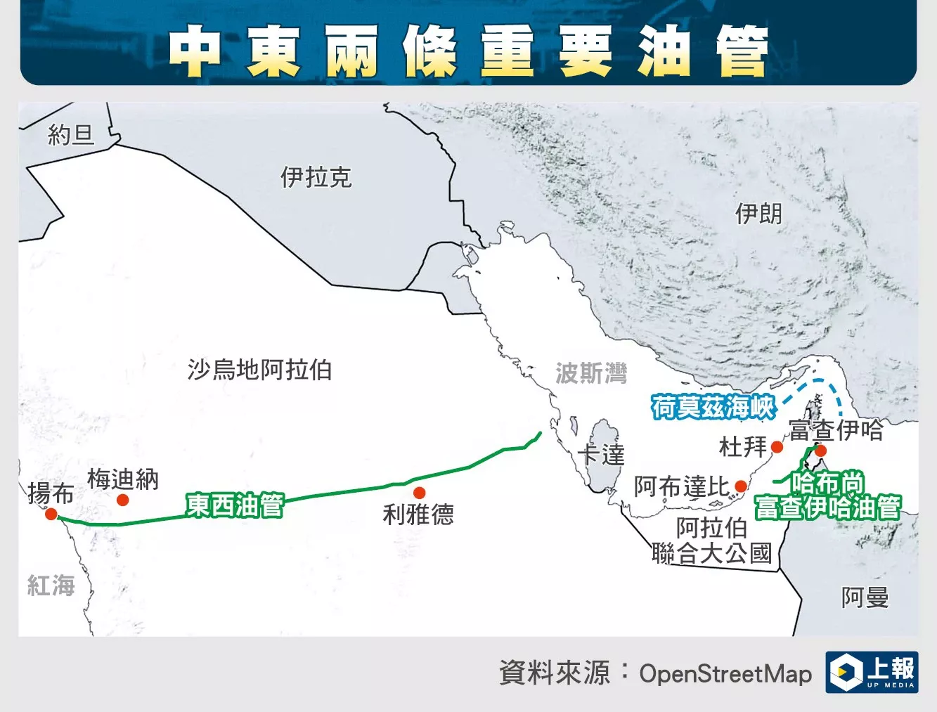 《华尔街日报》报导,中东有两条油管,一条是位于沙乌地阿拉伯的东西油管(East-West Pipeline),另一条位于阿拉伯联合大公国的哈卜尚-富查伊哈油管(Habshan-Fujairah Pipeline),如今,这两条油管是唯一能将中东石油大量输出的管道。