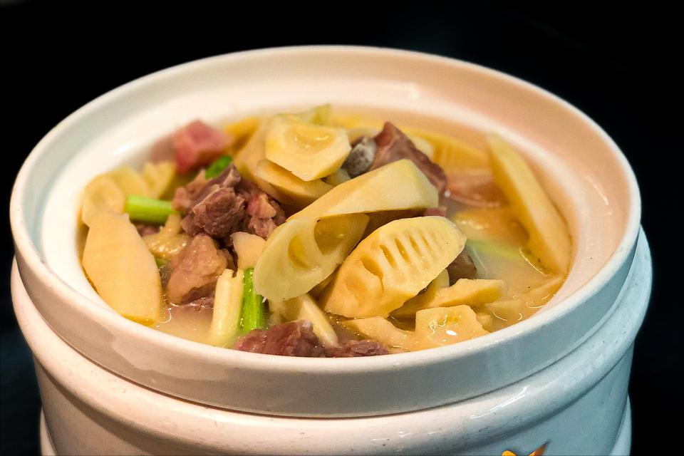 春笋排骨汤:春笋切块焯水,和排骨一起炖汤。排骨的油脂能润滑肠道,春笋的纤维能刺激蠕动,一润一刮,配合默契。