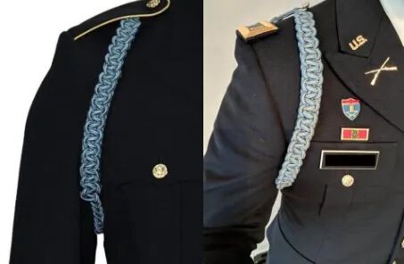蓝色步兵绳佩戴在右肩,穿过横式肩章的下面和腋下,并用绳环固定在肩章的纽扣上。如果是竖式肩章,就会在衣领边缘1/2英寸处增加一颗纽扣,用来固定绳环。