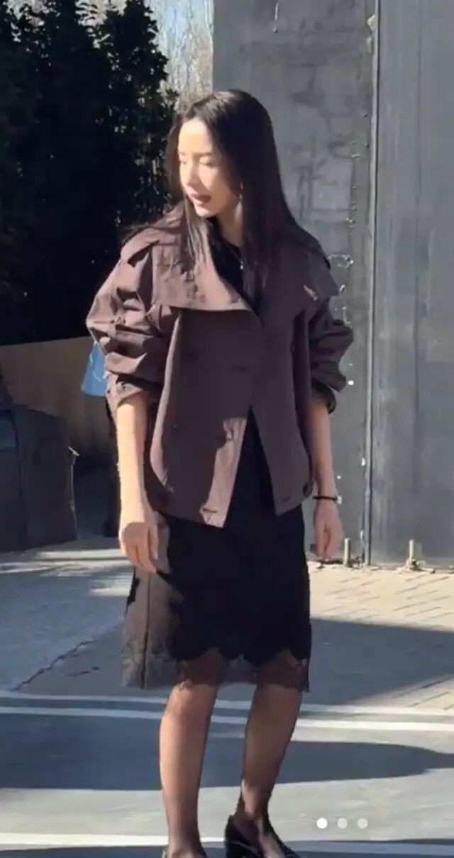 晒出的照片中,董洁换了两套造型,先来看看董洁的第一套造型,她身着一件深棕色短款风衣,内搭黑色连衣裙,裙摆带有蕾丝花边设计,整体造型简约中透着精致,展现出她一贯的优雅与知性。