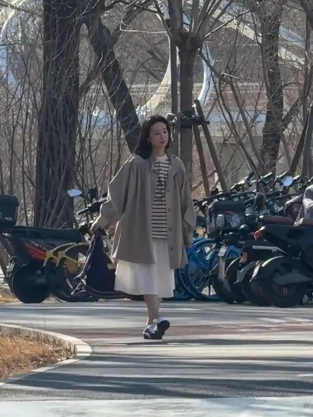 行走在户外小路上的董洁,姿态优雅,步伐轻盈,展现出良好的体态与气质,而背景中的树木与停放的电动车为画面增添了生活气息,阳光洒在她身上,更显温婉动人。