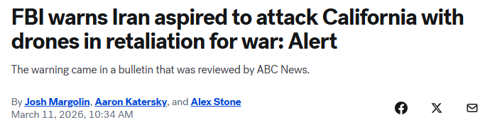 根据这份在2月底分发的警报文件:“我们近期获得的信息显示,截至2026年2月初,伊朗据称曾计划在美国对其发动打击的情况下,从停泊在美国本土外海的一艘身份不明的船只上使用无人机发动突然袭击,目标可能是加利福尼亚州境内尚未明确的地点。”