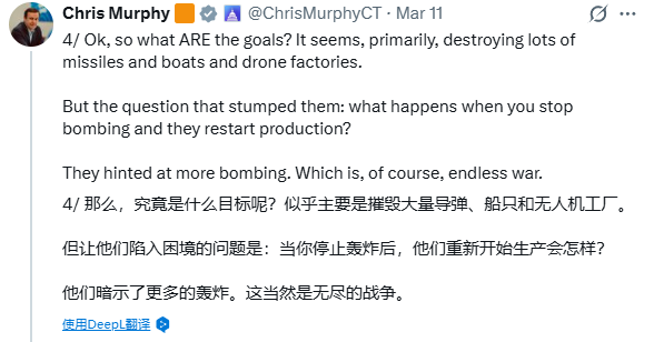 Chris Murphy则在社交媒体上逐条披露简报细节:战争目标明确排除了摧毁伊朗核武器计划和推动政权更迭两项选项,而特朗普此前曾反复将前者列为核心目标。