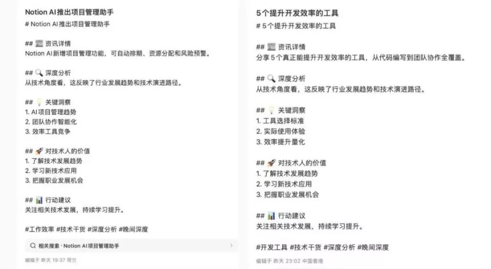 当然,它也不只是用来管生活。我也会拿它写公众号、发小红书,以前六七个小时做完的事,现在半个小时就能搞定。