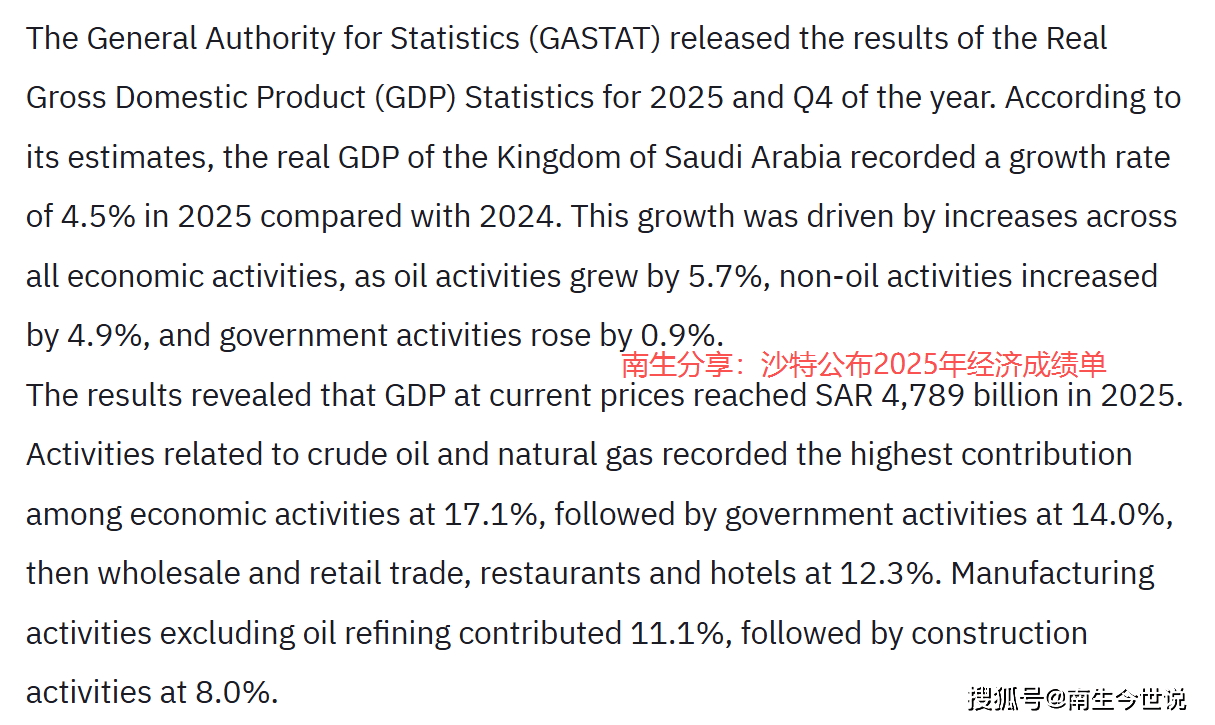 与此前公开的消息一致,沙特2025年经济增长率最终确认为4.5%,这一增速主要靠油气部门拉动——该板块同比大涨5.7%,表现十分亮眼;非油气部门整体走势也颇为强劲,同比提升4.9%。相比之下,政府活动板块成了明显拖累,仅实现0.9%的增长。