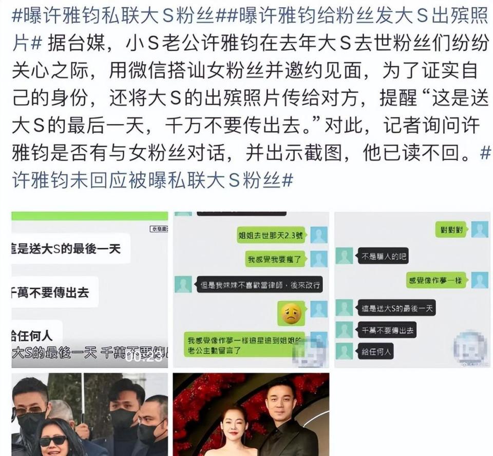 这次可不是什么夜店搂抱的小打小闹了,台媒直接甩出聊天记录截图,实锤许雅钧在大S刚走的那段日子,竟然拿着大S的出殡照,去私信撩大S的女粉丝 。