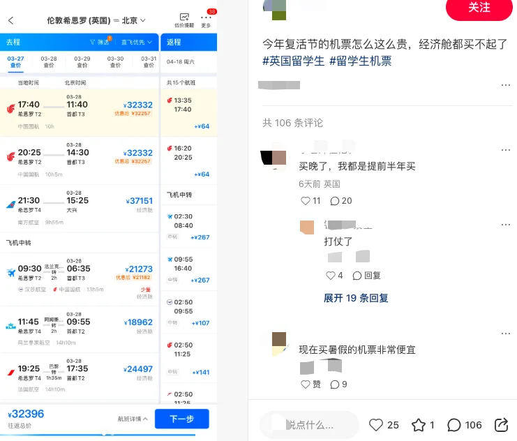 今年从英国回国的机票价格出现明显上涨,部分航班甚至已经突破五位数,让不少人直呼“回家成本太高”。