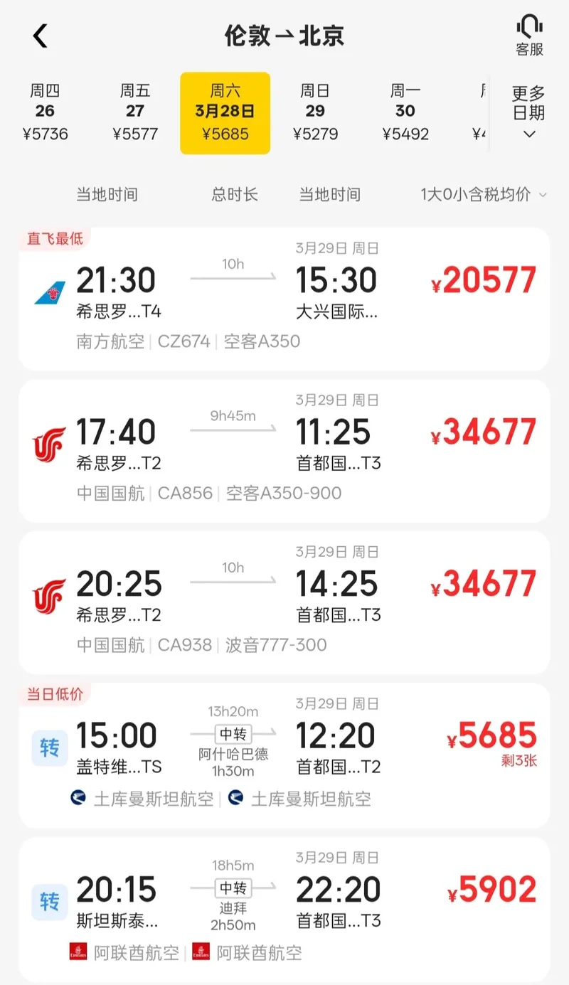 从搜索结果来看,从伦敦飞往中国的直飞航班价格普遍较高,部分时间段的机票价格已经达到上万元。当然,部分转机的航班价格大约在5000元人民币左右,相比直飞航线确实便宜不少。