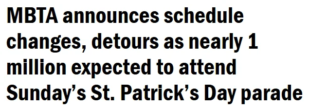 本周日,一年一度的圣帕特里克节游行将在南波士顿(South Boston)举办,预计地铁车厢拥挤、车站排长队、数十万人涌上街头的景象将再次出现。