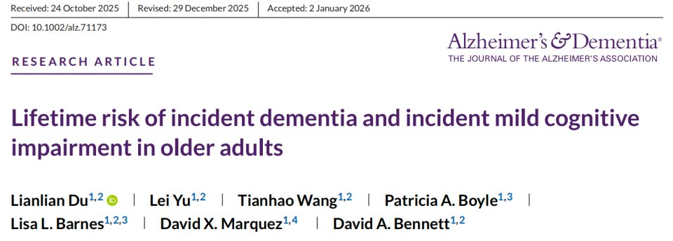 2026年2月,国际顶级医学期刊《Alzheimer's & Dementia》(IF:11.1)发表了一项重磅研究。来自拉什阿尔茨海默病中心(RADC)的顶尖科研团队,追踪了旗下五大核心队列的中老年人(痴呆分析纳入4677人,MCI分析纳入3990人),进行了长达30年的年度随访。人类历史上第一次,相对精准地描绘出了从55岁到105岁,全生命周期的大脑认知退化轨迹。