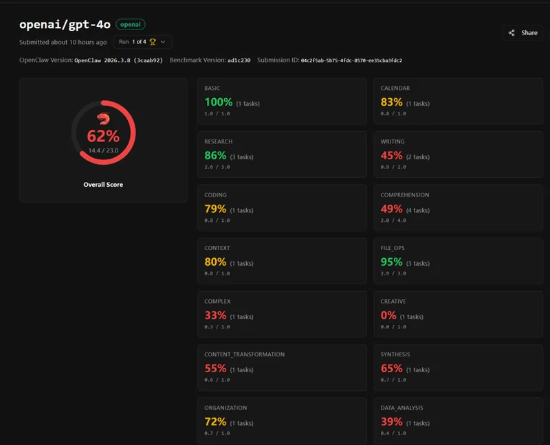 但有些模型的排名就有点出人意料了。例如 OpenAI 的新模型 GPT-5.4,成功率只有 78%,排在榜单第九。