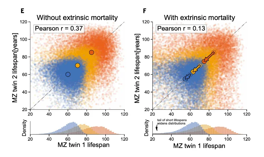 在剔除意外因素的理想状态下(图 E),同卵双胞胎寿命相关性高达 0.37;而一旦加入历史水平的意外噪音(图 F),相关性便因随机早逝形成的“数据长尾”干扰而骤降至 0.13。| 参考文献[1]