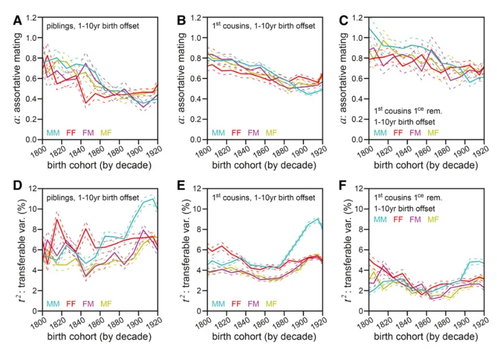图 A、B、C:择偶偏好系数;图 D、E、F:真正的遗传贡献。Calico发现,完全没有血缘关系的亲戚(比如妯娌、连襟)的寿命竟然也高度相关,进而得出“长寿往往是‘门当户对’的结果”这一结论 | 参考资料[3]