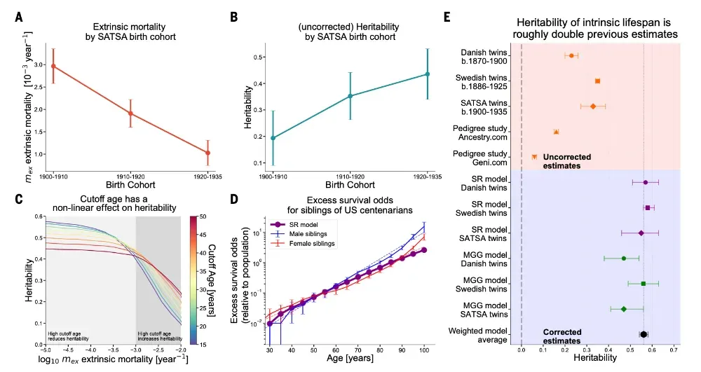 研究发现,随着疫苗和卫生条件的普及,当时的“外源性死亡率”显著下降了 3 倍之多。而正如模型所预测的那样,随着这些随机干扰消失,原本被掩盖的寿命遗传率便随之“水涨船高”,自然上升了约 2 倍。