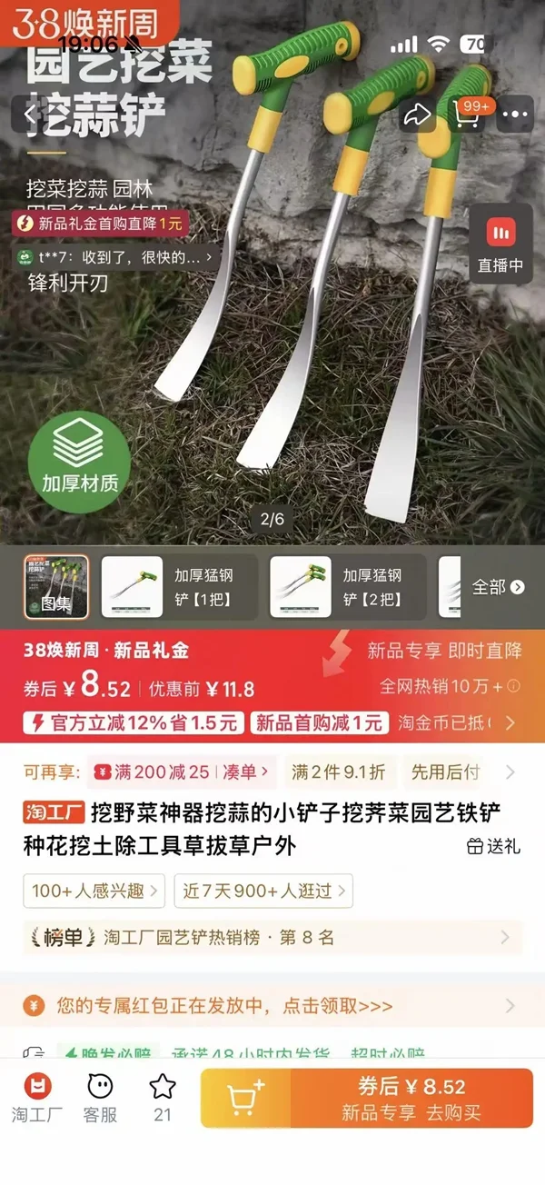 一位网店店主告诉记者,3月以来,与“挖野菜”相关的便携铲、小型铲类产品开始有双位数的销售增长。在淘工厂·好货严选旗舰店,一款挖野菜神器显示全网热销突破10万+。