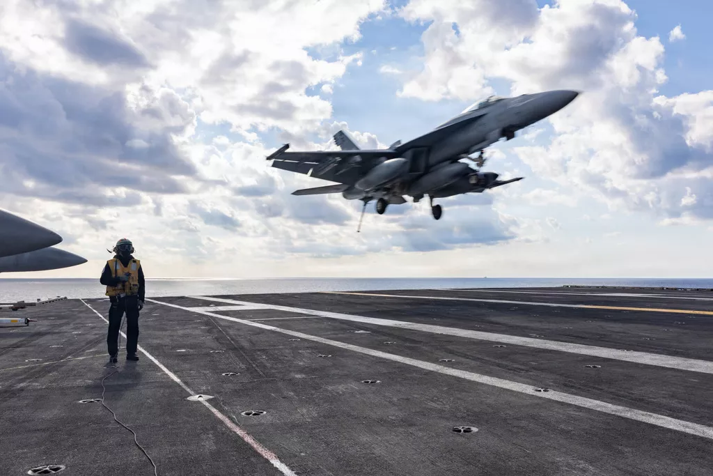 2026年3月6日, 史诗怒火行动期间,F/A-18E超级大黄蜂战机起降福特号。(DVIDS)