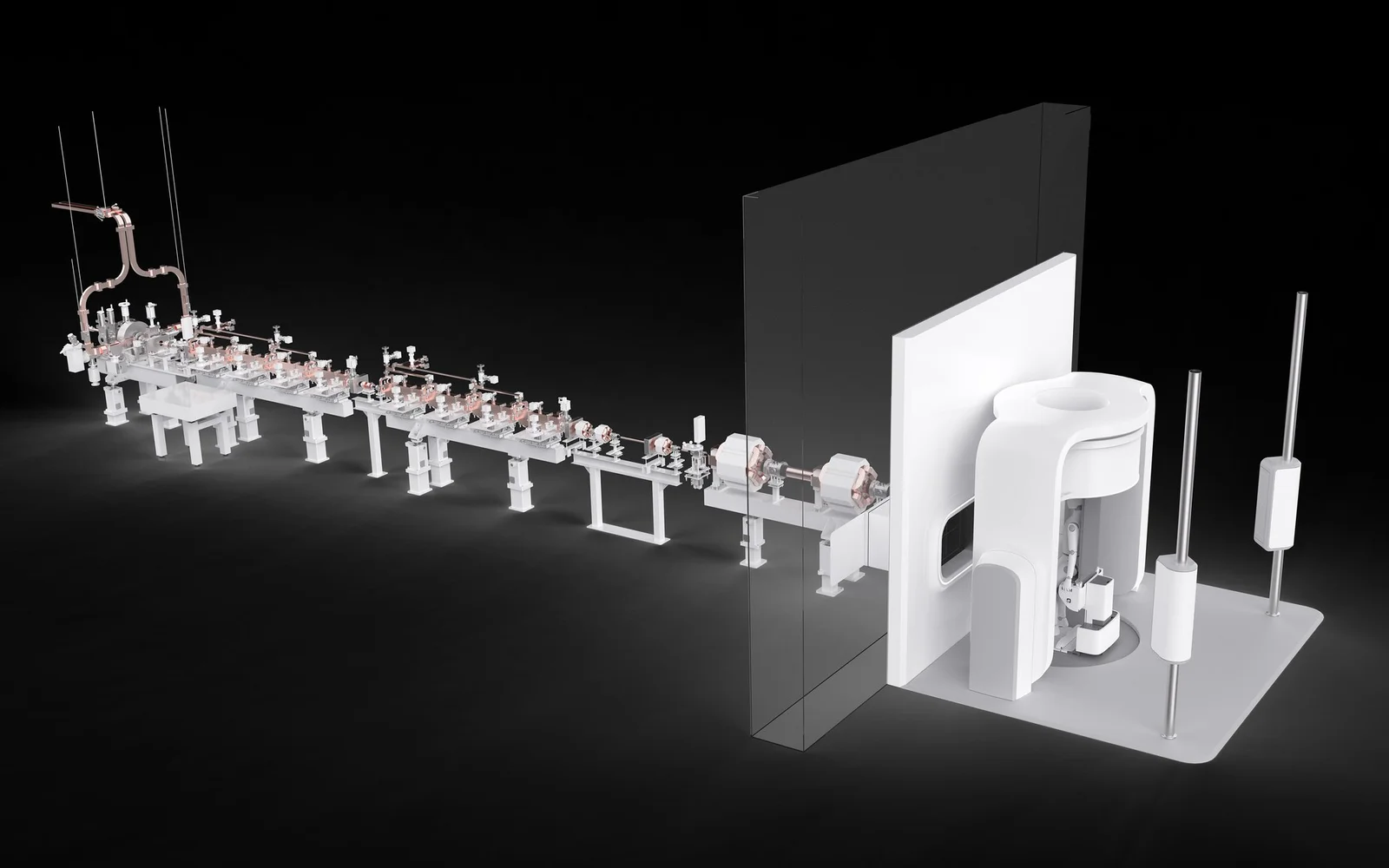 Theryq的FLASHDEEP系统拥有一个13.5米长、140 MeV的直线加速器。这足以治疗体内20厘米深处的肿瘤。在瞬间照射期间,患者将保持支撑站立姿势。
