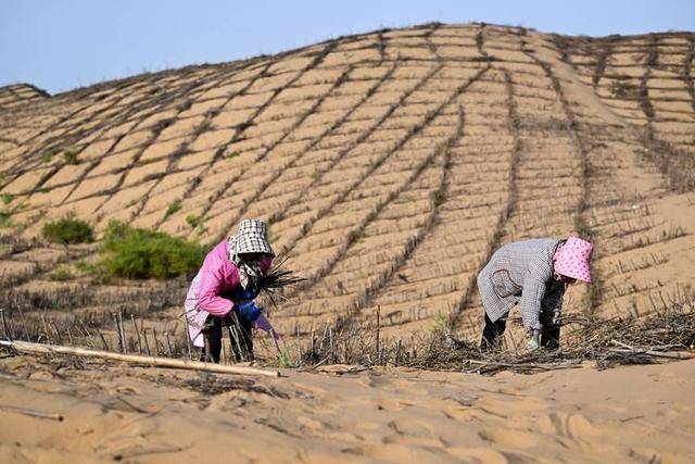 之后,他们借鉴毛乌素的经验,又创新出“网格沙障+植物固沙”的办法,种植甘草等耐旱作物,既固定了沙丘,又能带来经济收入。