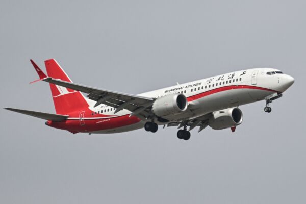 2025年4月16日,上海航空一架波音737-8 MAX飞机准备降落在上海浦东国际机场。(Hector Retamal/AFP)