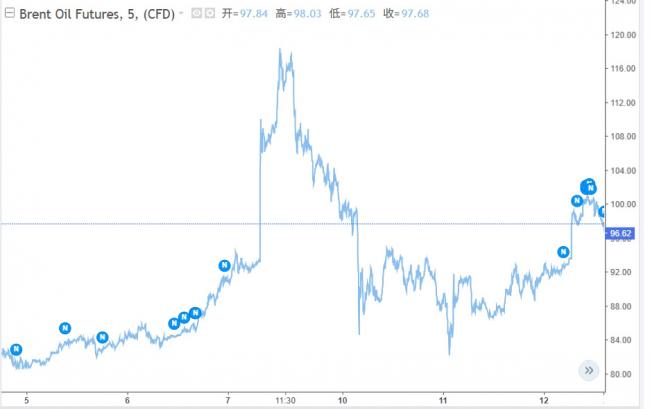 在上午11:30一度再次突破每桶100美元,最高至101.38美元,比周三收盘大幅上涨10.2%,直至中午才开始回落,至16:00,每桶回落至96.32美元,仍比周三上涨4.7%。