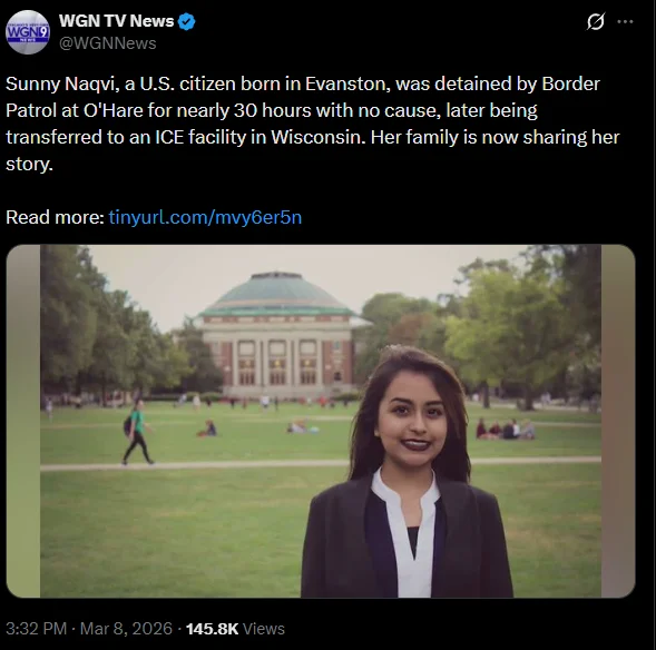 然而,当他们于上周四(5日)抵达芝加哥奥黑尔国际机场时,联邦执法人员突然将Naqvi拘留。她的律师表示,执法人员给出的理由是其“旅行记录存在可疑之处”。