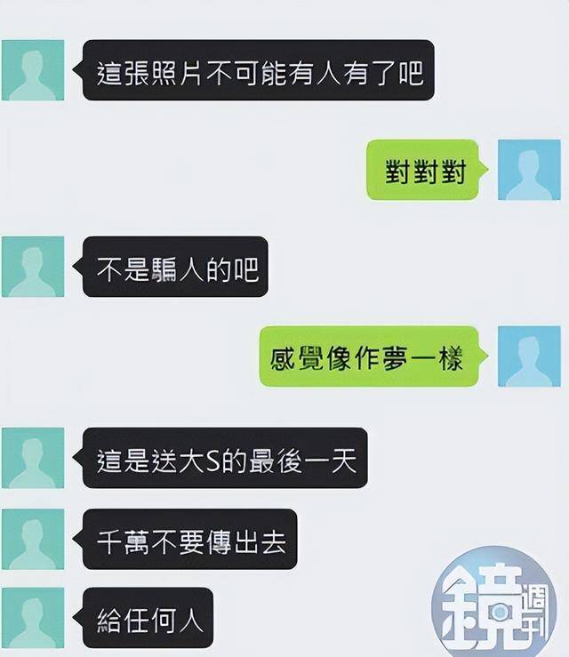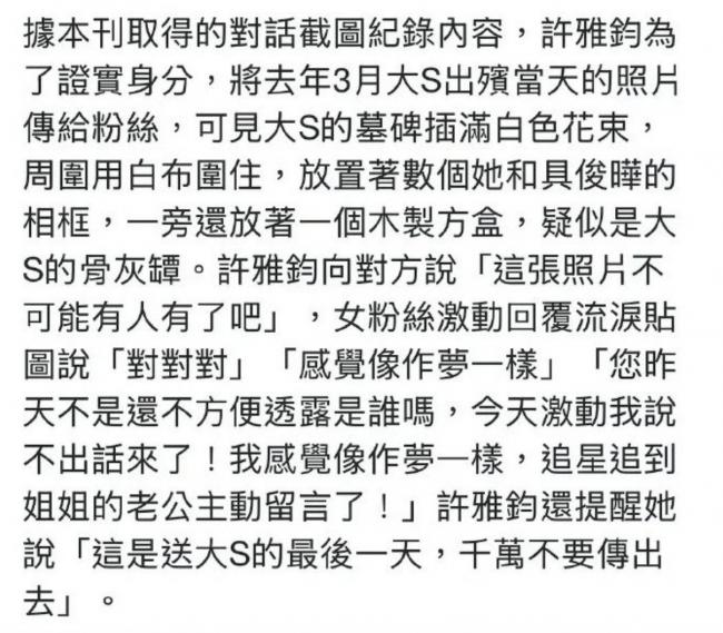 女粉丝一开始不信他是真的许雅钧,怀疑他是水军,许雅钧为了自证身份,竟然直接把大S出殡现场的照片发给了对方,还特意叮嘱“这张照片没人有,千万不要传出去”。