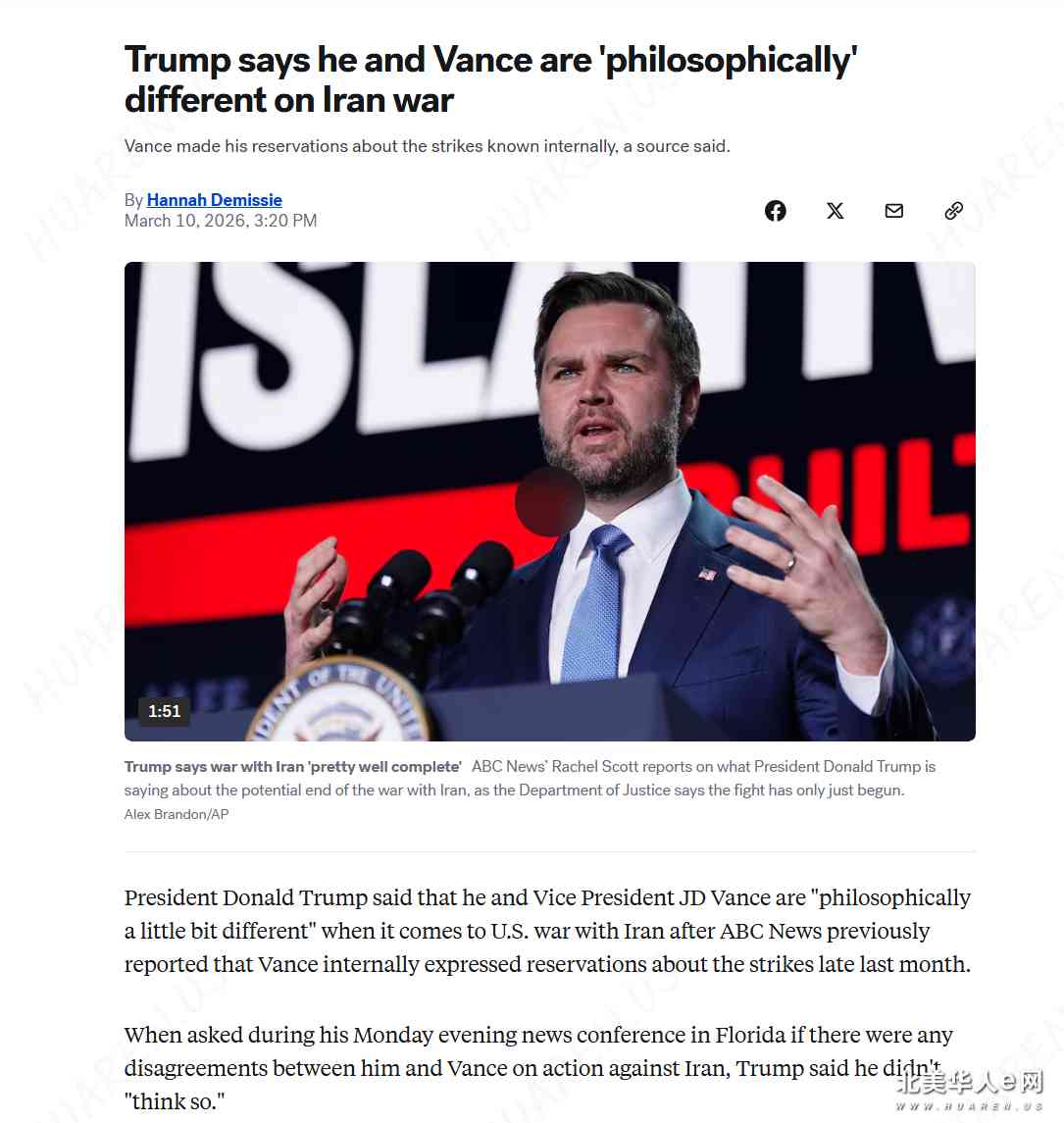 川普证实万斯不认同开战:philosophicallyABC新闻