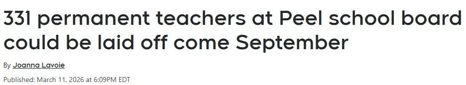 皮尔区公校教育局(Peel District School Board)因学生人数下降,已向331名教师发出裁员通知,涉及小学和中学两个学段,裁员将于今年9月新学年生效。一名昨晚接受 INsauga.com 采访的教师表示,她已被通知成为“富余教师(surplus)”,必须等到新学年开始时才能知道自己是否会被重新召回课堂任教。教育局资料显示,该局目前拥有约1.1万名全职教师和约1500名临时或代课教师。学生总人数约为14.5万人,在过去八年中减少了近1万人。