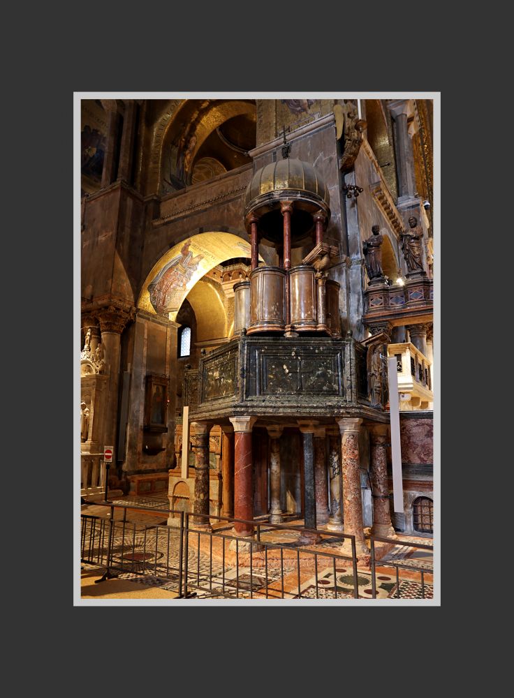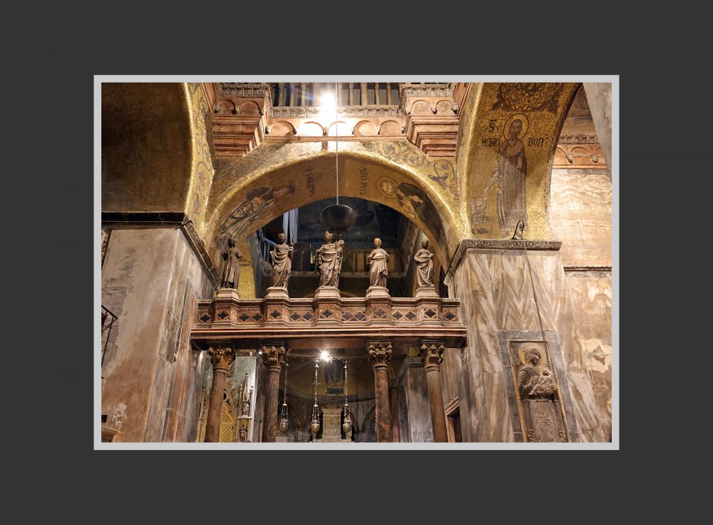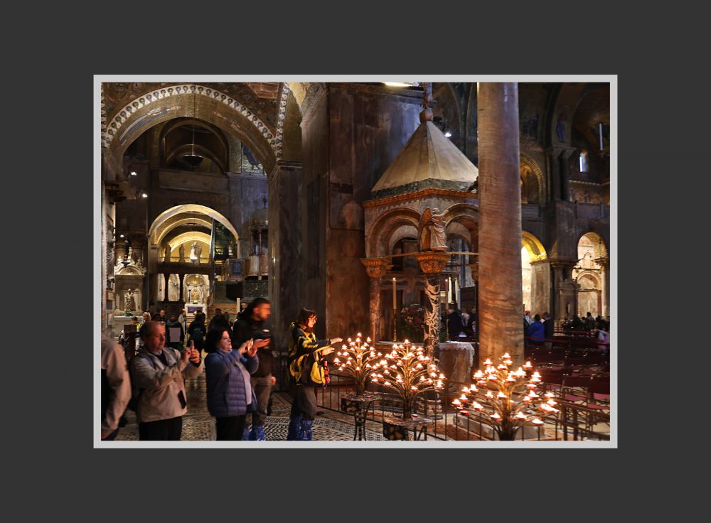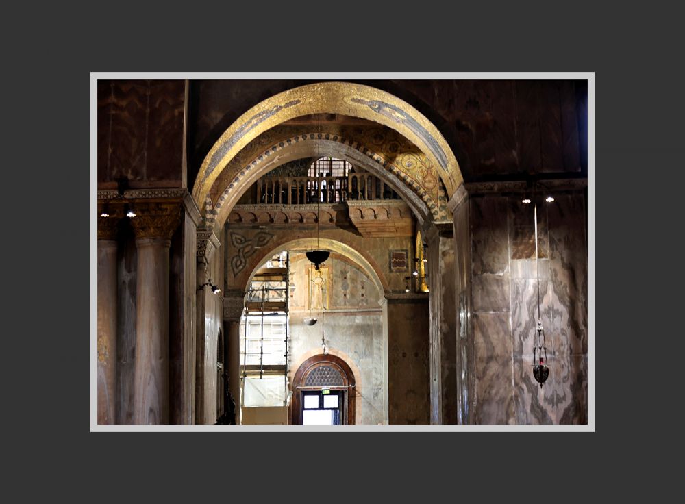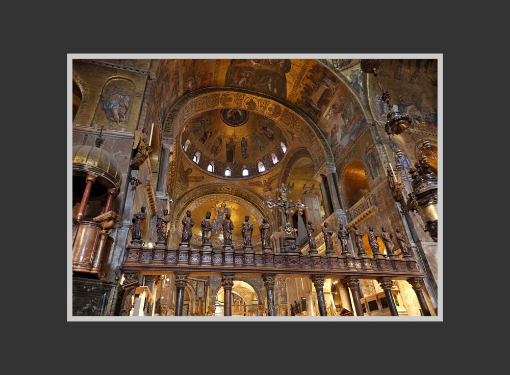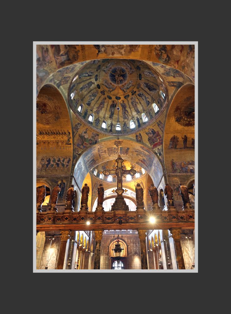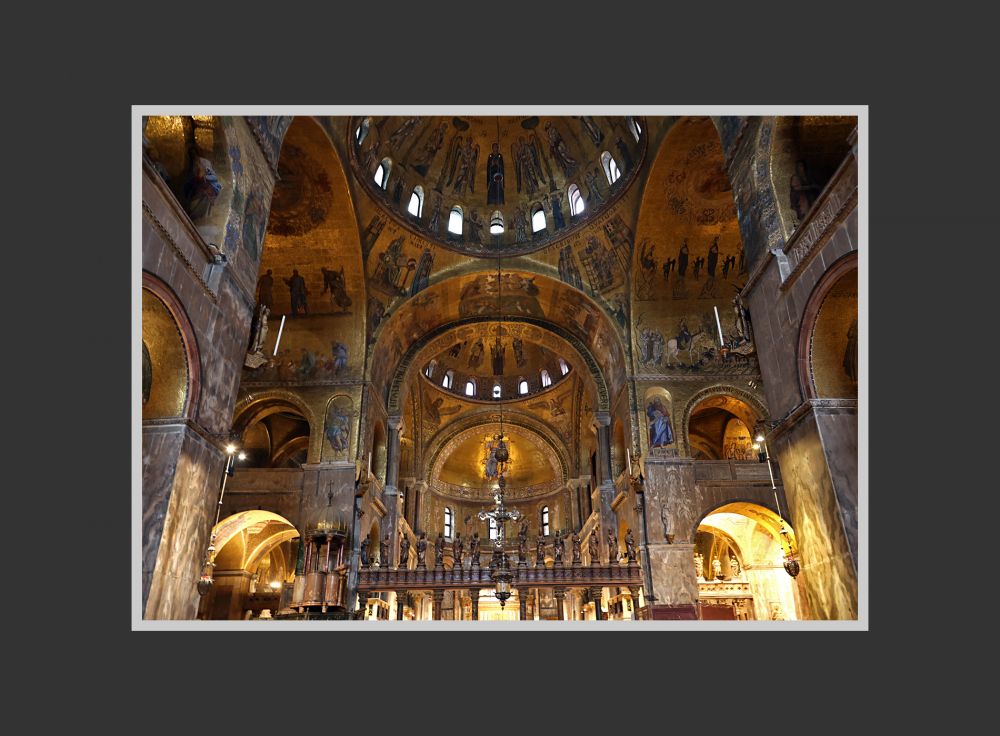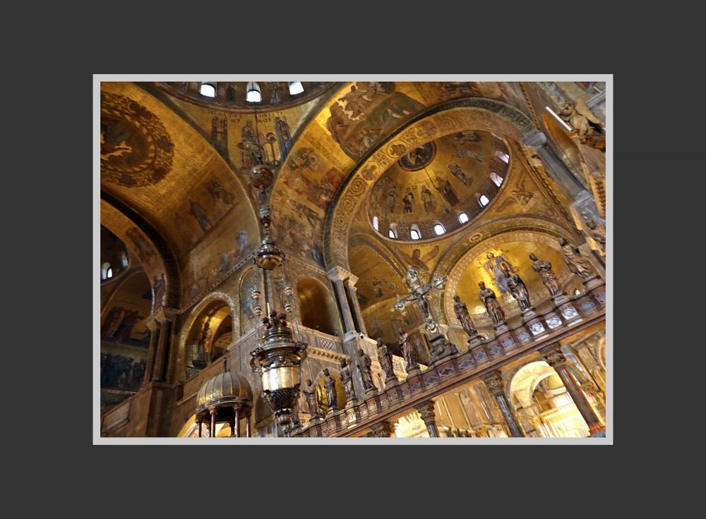 威尼斯圣马可大教堂的内部的穹顶和墙面,总面积约 8000 平方米,没有一点裸露,完全覆盖着金色马赛克,所以该教堂又被称为“黄金教堂”。如今看上去,颜色有些暗,有些地方类似于铜色。这是因为千年里教堂内蜡烛的烟熏和海边含盐分的空气侵蚀所致。可以想见, 几百年前刚刚贴满马赛克时,教堂的金碧辉煌和大量的马赛克壁画是很令人震撼的,各方来宾也一定叹服威尼斯共和国的富庶和有文化 — 当局要的就是这个效果!如今在我的眼中,它已经不那么金光闪闪了,但我感觉这恰能显示历史的厚重,丝毫不减其魅力。