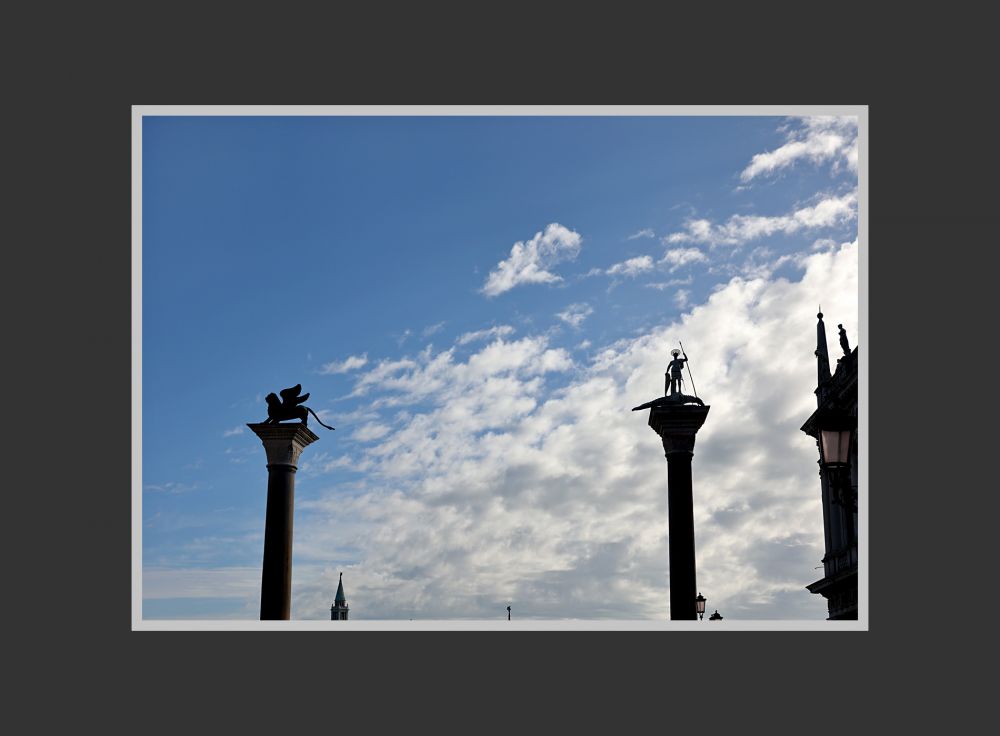 当遗骨抵达威尼斯后,总督与民众以崇高仪式迎接(他们一点也不觉得偷来的有什么不堪)。从此,威尼斯获得了新的宗教核心,替代了原本的守护者圣西奥多(St Theodore,一位武士殉道者),城市徽号也由骑龙的圣西奥多改为有翼的雄狮的圣马可(下面这张照片是总督宫前面的两根石柱,分别表现威尼斯的新旧两个守护神)。这一转换不仅是宗教象征意义的改变,更是政治与外交地位的跃升,标志着威尼斯脱离了阿奎莱亚教区,并在拜占庭与拉丁世界之间形成自己独特的身份。