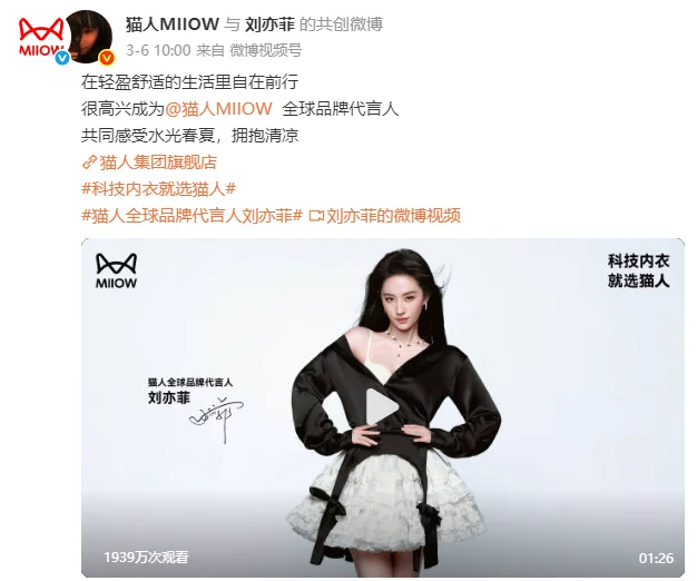 最近,国民内衣品牌猫人MIIOW搞了一个大动作,正式签约刘亦菲成为全球品牌代言人。