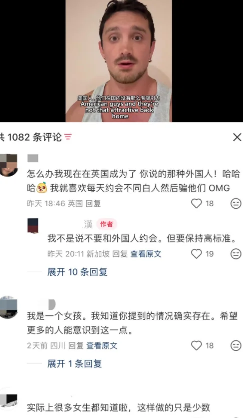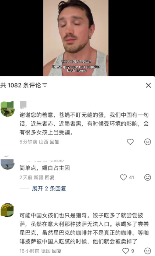 这名博主在视频中提到,他的一位中国朋友曾向他抱怨,有一名欧洲男子几乎每天都带不同的女生回酒店,甚至因此被酒店方面投诉,这样的行为让他感到十分困惑,因为在他看来,一些人在本国并不具备特别的吸引力,但到了中国之后,却因为“外国人”这一身份获得了额外的关注与机会,他认为,这种现象背后其实是一种不必要的身份光环。