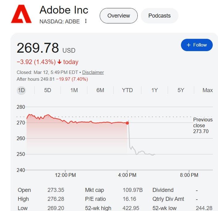 消息传出后,周四收跌逾1%的Adobe股价盘后跌幅迅速扩大至逾7%。这家Photoshop软件的制造商今年以来股价已累跌超20%,股价徘徊于近三年低点附近,较2021年历史高点更已下跌逾60%。