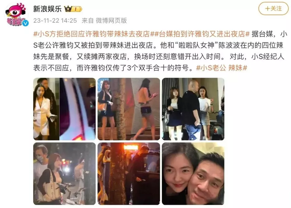 与小S结婚后,许雅钧被狗仔拍到在夜店出现的次数已经多到数不清了,小S一开始还会出来撑老公,说他的行程自己都知道,只是招待朋友而已。