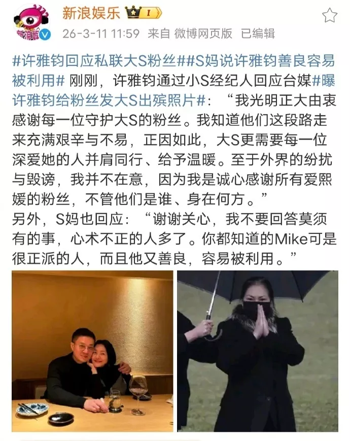 很快,许雅钧通过小S的经纪人发布声明澄清:“我光明正大由衷感谢每一位守护大S的粉丝,至于外界的纷扰与诽谤,我并不在意。”