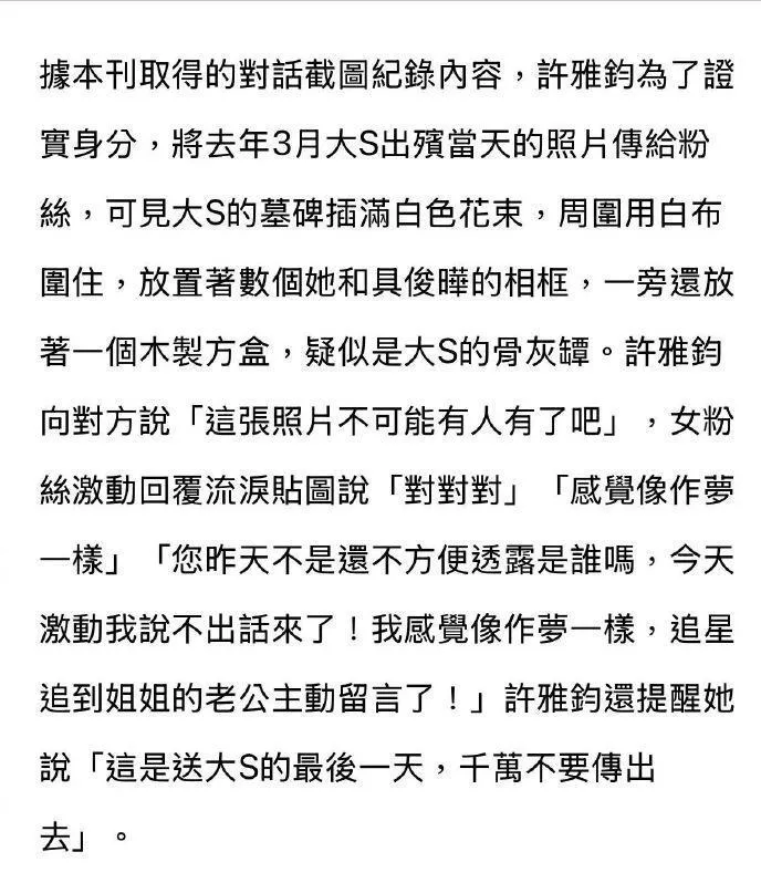 而为了证实自己的身份,许雅钧发给对方一张大S出殡当天的照片,照片中可见大S的墓碑插满了鲜花,一旁还有疑似放置骨灰的木盒。