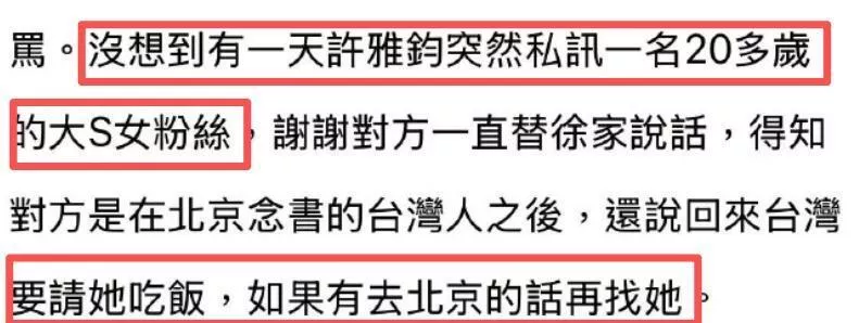 据台媒爆料,许雅钧私讯一名20多岁的大S女粉丝,谢谢她一直为徐家说话,还打算请她吃饭,如果去北京的话会再找她。