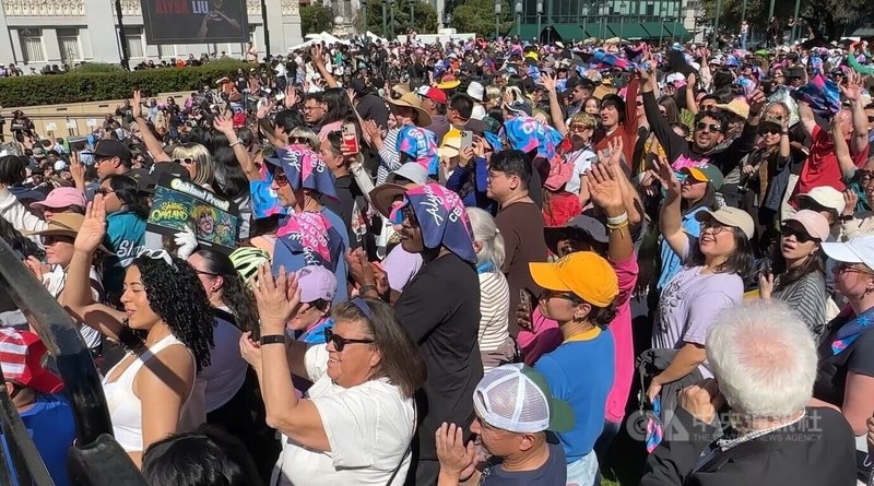 今天派对在奥克兰市政厅外的草坪上举行,吸引大批人潮涌入,警力维安森严。