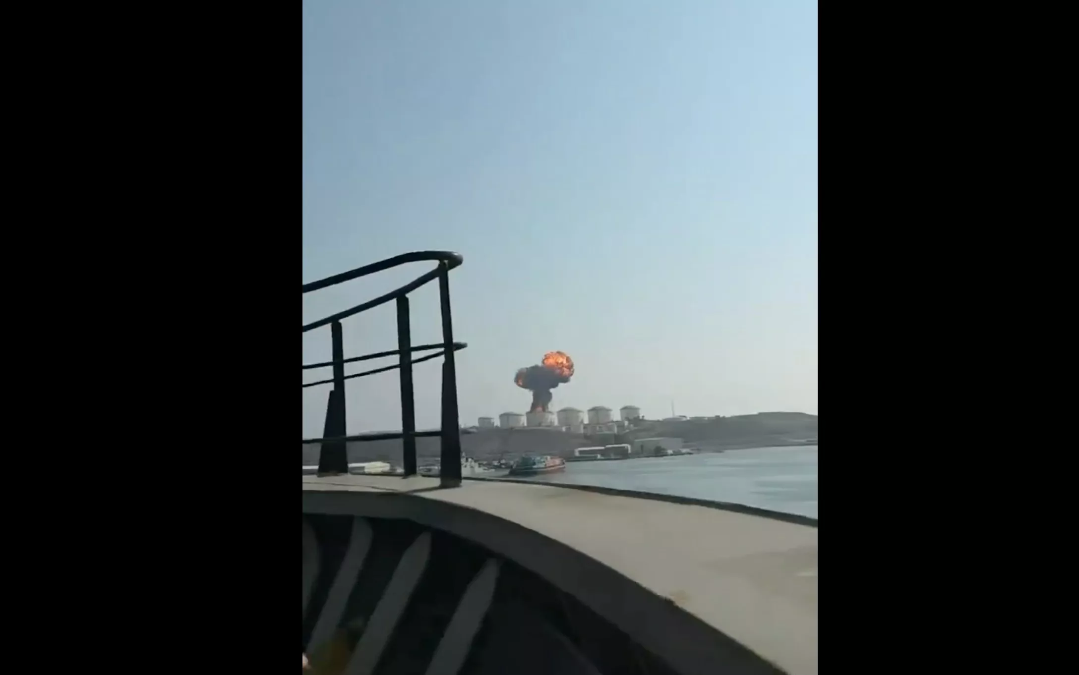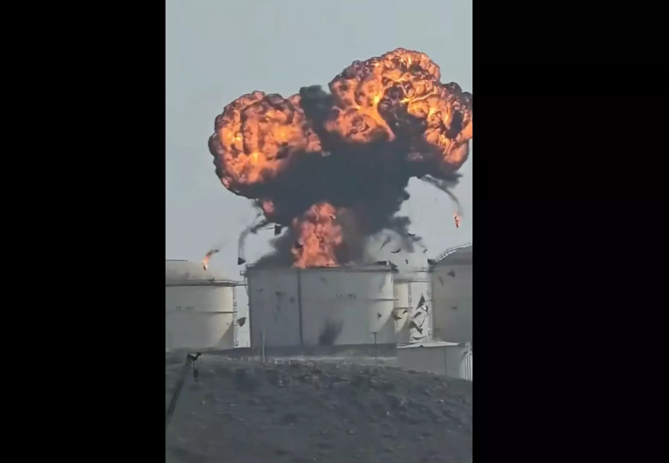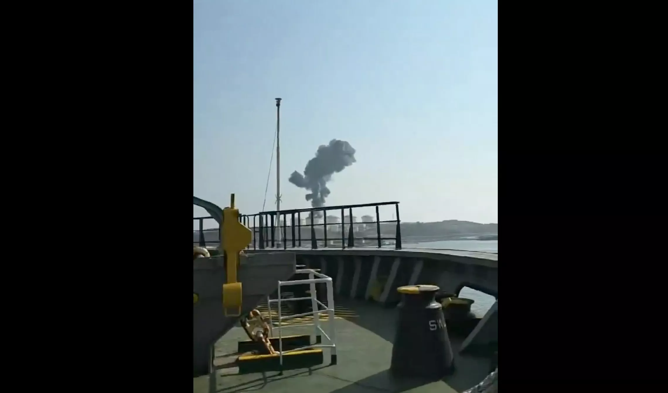 一段由的港口附近船员指摄、经外媒核实的影片显示,当时一架无人机正逐渐近港口后,撞上白色的石油储罐。油罐随即发生爆炸,升起巨大火球,浓浓黑烟席卷半空。