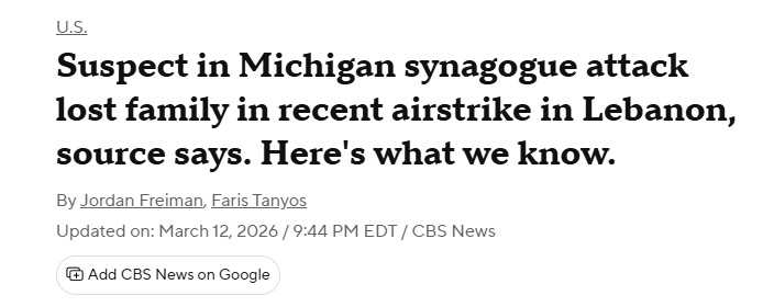 消息人士称,密歇根州犹太教堂袭击案出现新进展,嫌疑人据称在近期黎巴嫩一次空袭中失去了多名亲属。