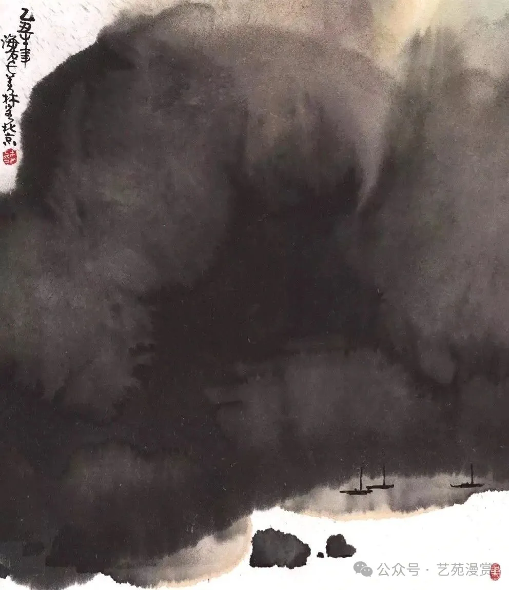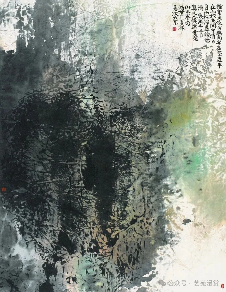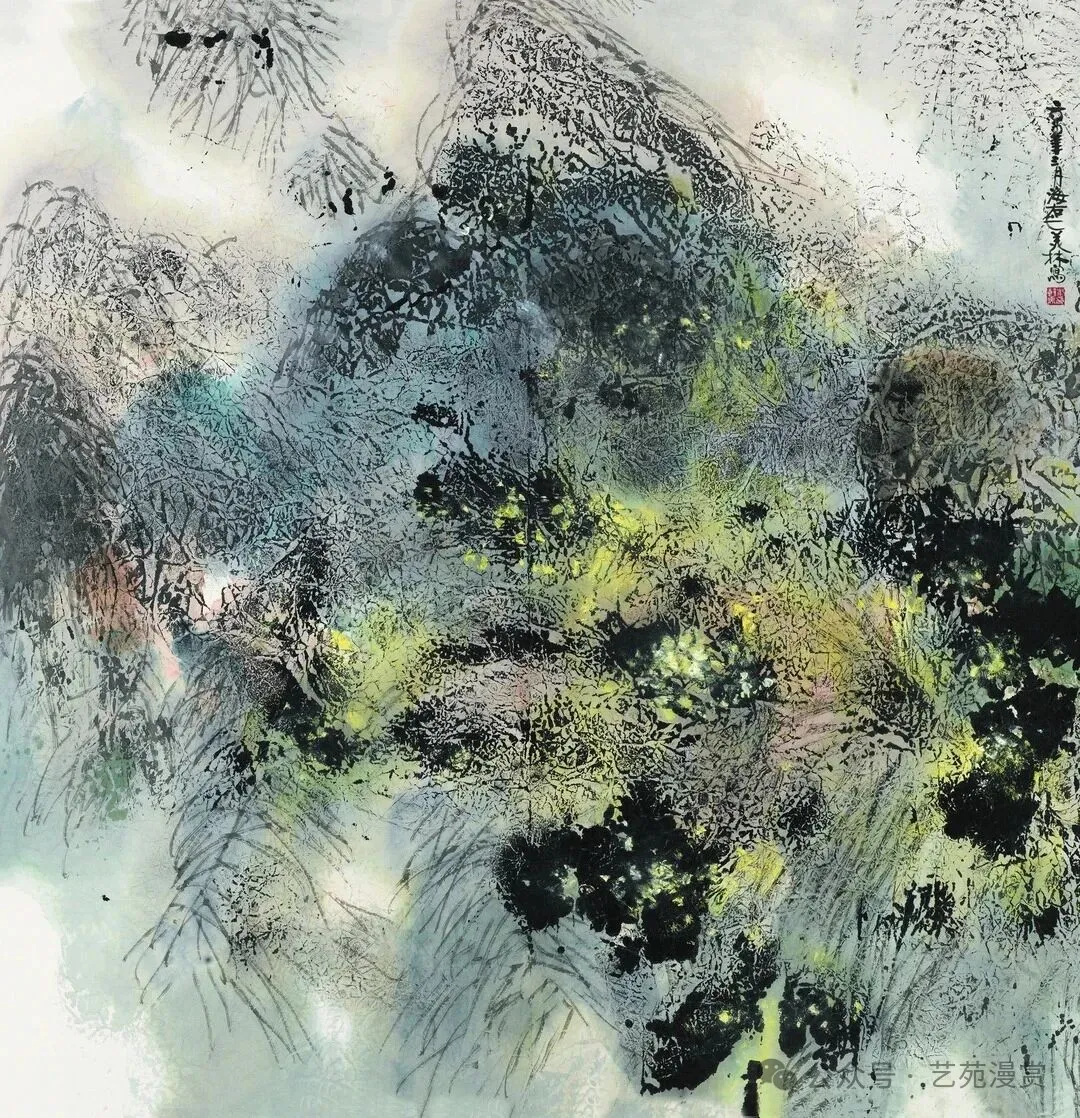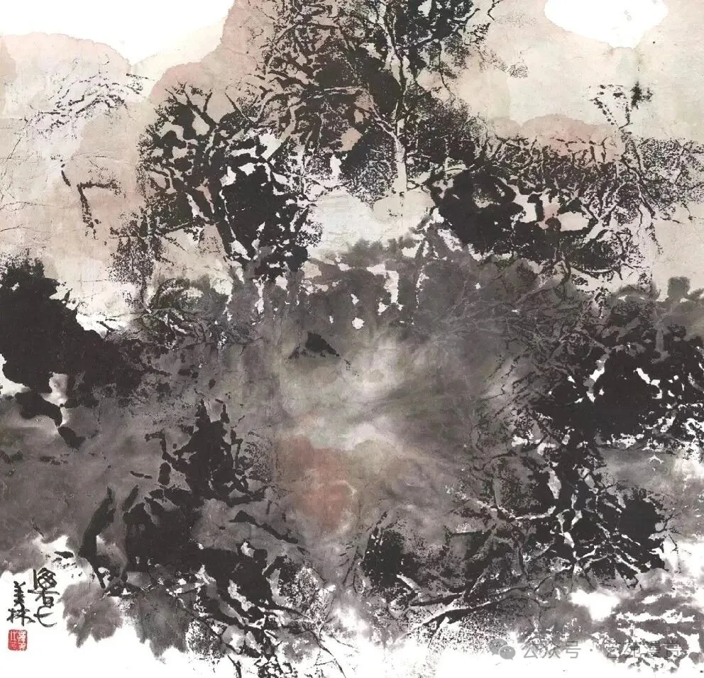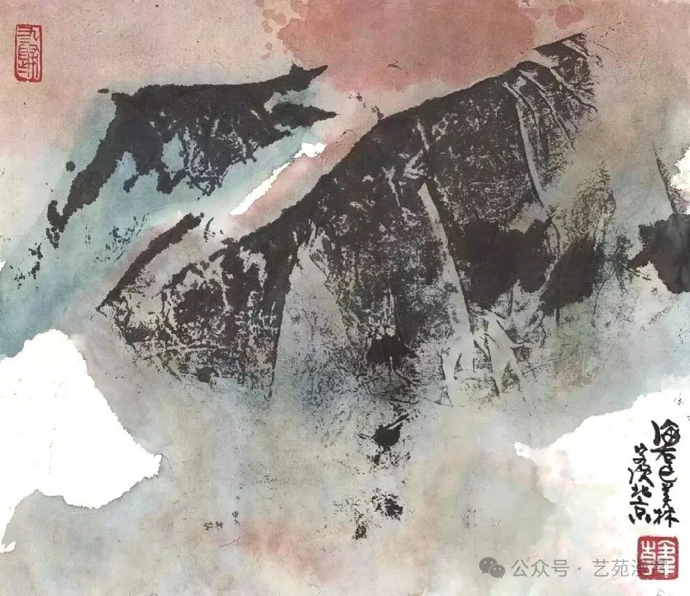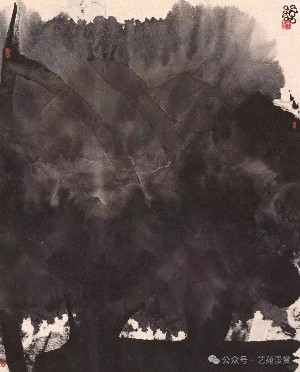 但是,韩美林先生的山水画实在令人不敢恭维。山水画方面,韩美林还是追求意向,实验了中国画墨色的自然变幻与流动,造成四不像的效果。画面显得高深,实则缺乏传统技法的功底,只是一种创新实验,并且不算成功。他主要使用两种技法:泼墨与揉纸。泼墨追求灵动与自然,揉纸追求纹理与质感,但这两点都没太做好。